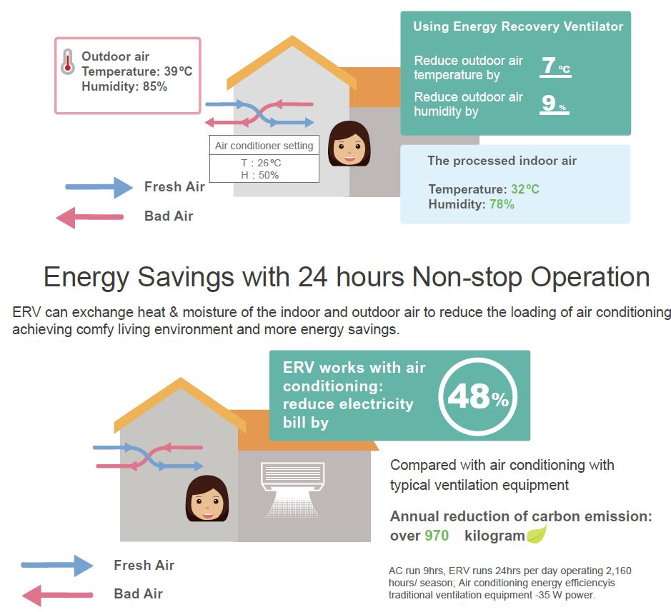 To reduce loading of air conditioning by exchanging indoor and outdoor air. Have a continuous comfortable living environment.