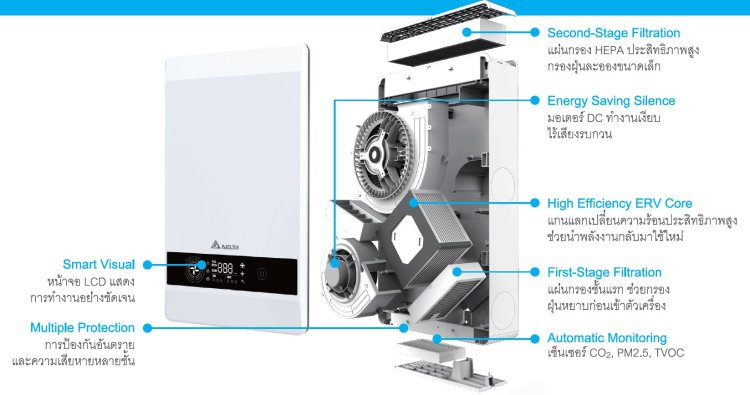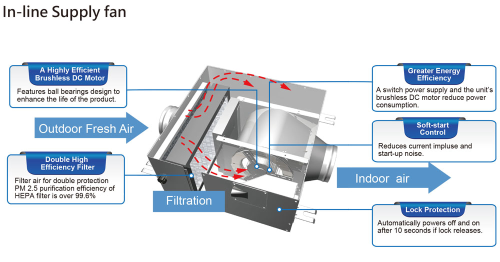 The machine will bring fresh air in with filter function and exhaust pollutants out from your home.